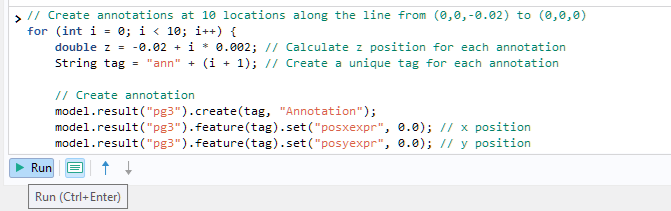 A close-up of the Java Shell window showing the generated code for creating the annotations. Click Run to plot the annotations as before.