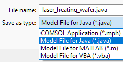 A close-up of the Save as type dropdown menu, with Model File for Java highlighted. This will create a text file with a .java extension, which can be compiled into a Java .class file for use as a standalone Java component. This approach runs COMSOL Multiphysics® without the COMSOL Desktop® user interface. The .java file contains the entire model setup through API code. In this case, however, we will use the file solely to identify potential issues in the model setup. (Note that using this functionality is unrelated to compiling apps with COMSOL Compiler™.)
